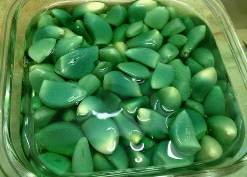 接下来,将处理好的蒜头放入清水中浸泡,大约浸泡24小时。这个过程中,蒜头会逐渐变绿。浸泡完成后,将蒜头取出,沥干水分。